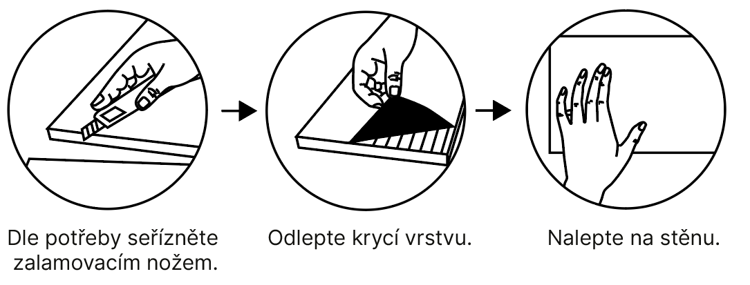 Je vhodné si na zeď načrtnout pomocí vodováhy vodící čáry, podle kterých nalepíte nástěnku rovně. Pokud Vám rozměr nevyhovuje, můžete si desky seříznout na požadovaný rozměr pomocí ostrého nože a pravítka.