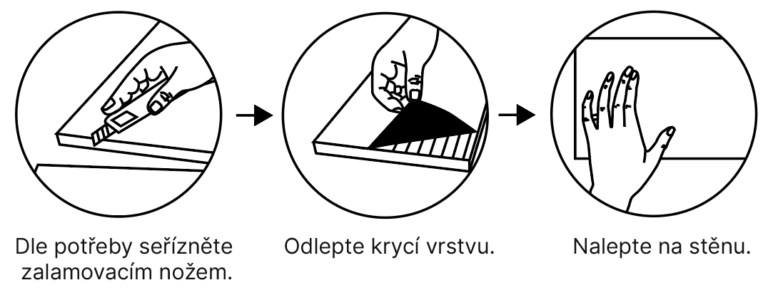 Je vhodné si na zeď načrtnout pomocí vodováhy vodící čáry, podle kterých nalepíte nástěnku rovně. Pokud Vám rozměr nevyhovuje, můžete si desky seříznout na požadovaný rozměr pomocí ostrého nože a pravítka.