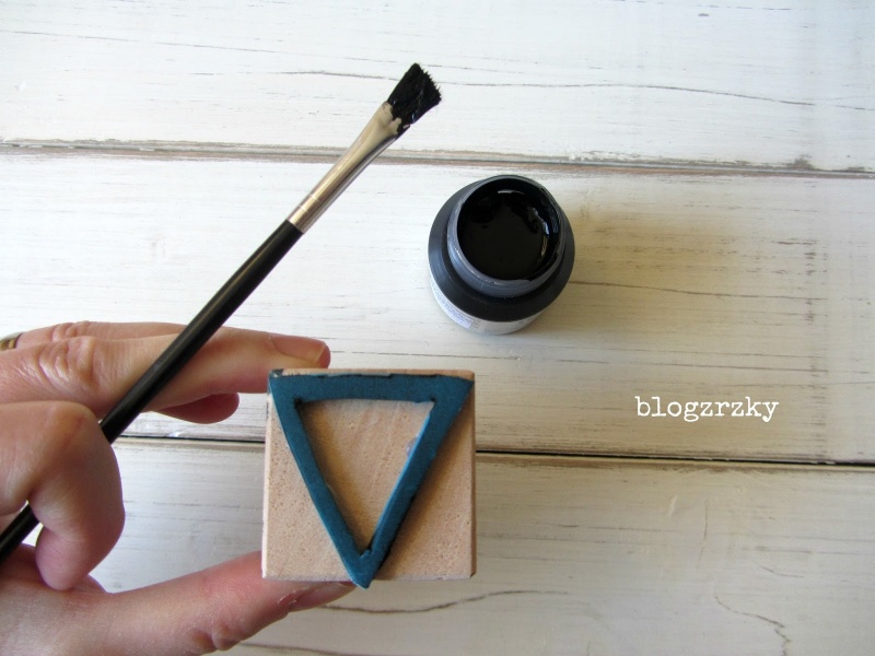U polštáře jsem zvolila jednoduchý geometrický tvar trojúhelníku ve dvou variantách - plný trojúhelník a pouze jeho obrysy. A také jsem využívala různých odstínů. Po natření razítka barvou jsem obtiskla černočernou a bez dalšího natření jsem tiskla ještě jednou, dvakrát, proto i ty šedé trojúhelníky. Tiskla jsem "na divoko", bez ladu a skladu, každý polštář je originál. Důležitý poznatek pro příště - barvy se propíjejí! Takže podložit nějakým papírem - dovnitř polštáře vložte nějaký list, ať se vám barva neprosákne i na druhou stranu polštáře jako mně. U tašky jsem to tak už aplikovala a v pohodě. I na tom polštáři to jde samozřejmě spravit, potisknete druhou stranu přesně tak, jak vám ukazují propité tvary... Anebo budete pečlivě dbát na to, že polštáře budou otočeny vždy jen tou správnou stranou k vám :)