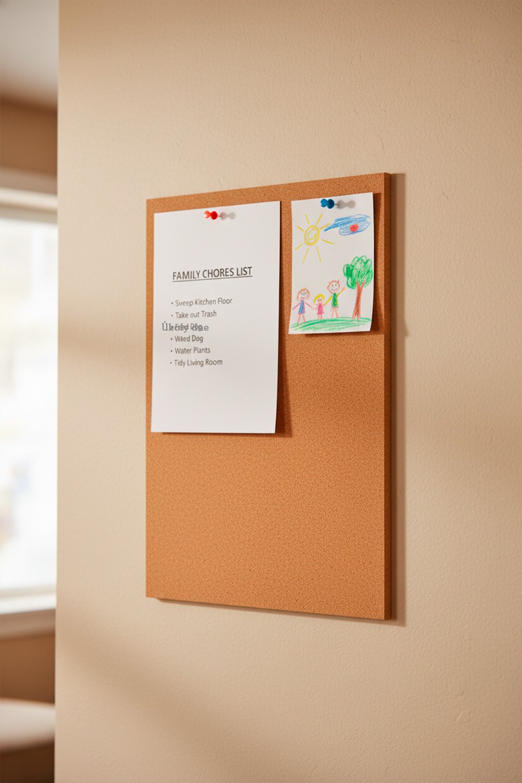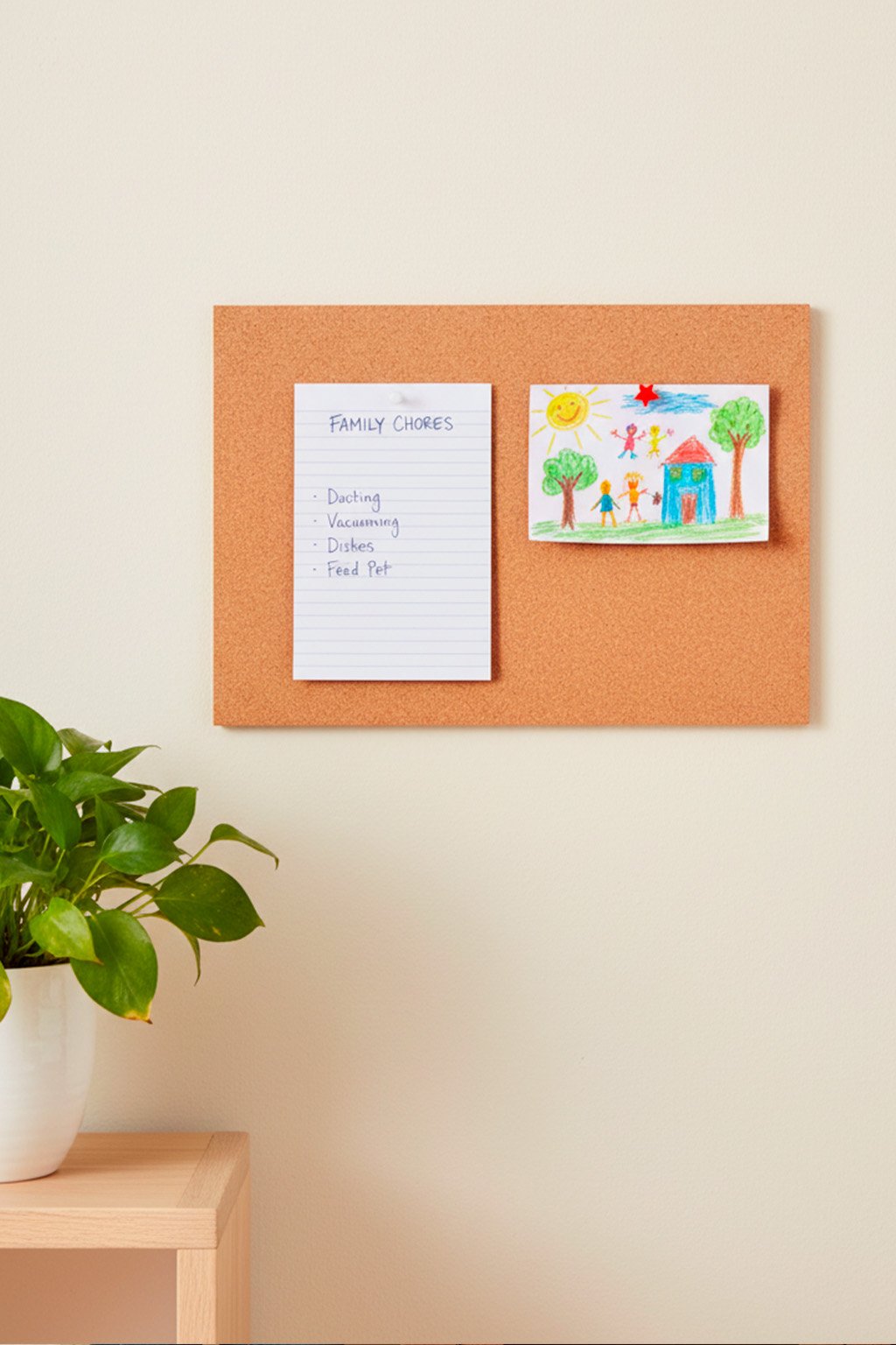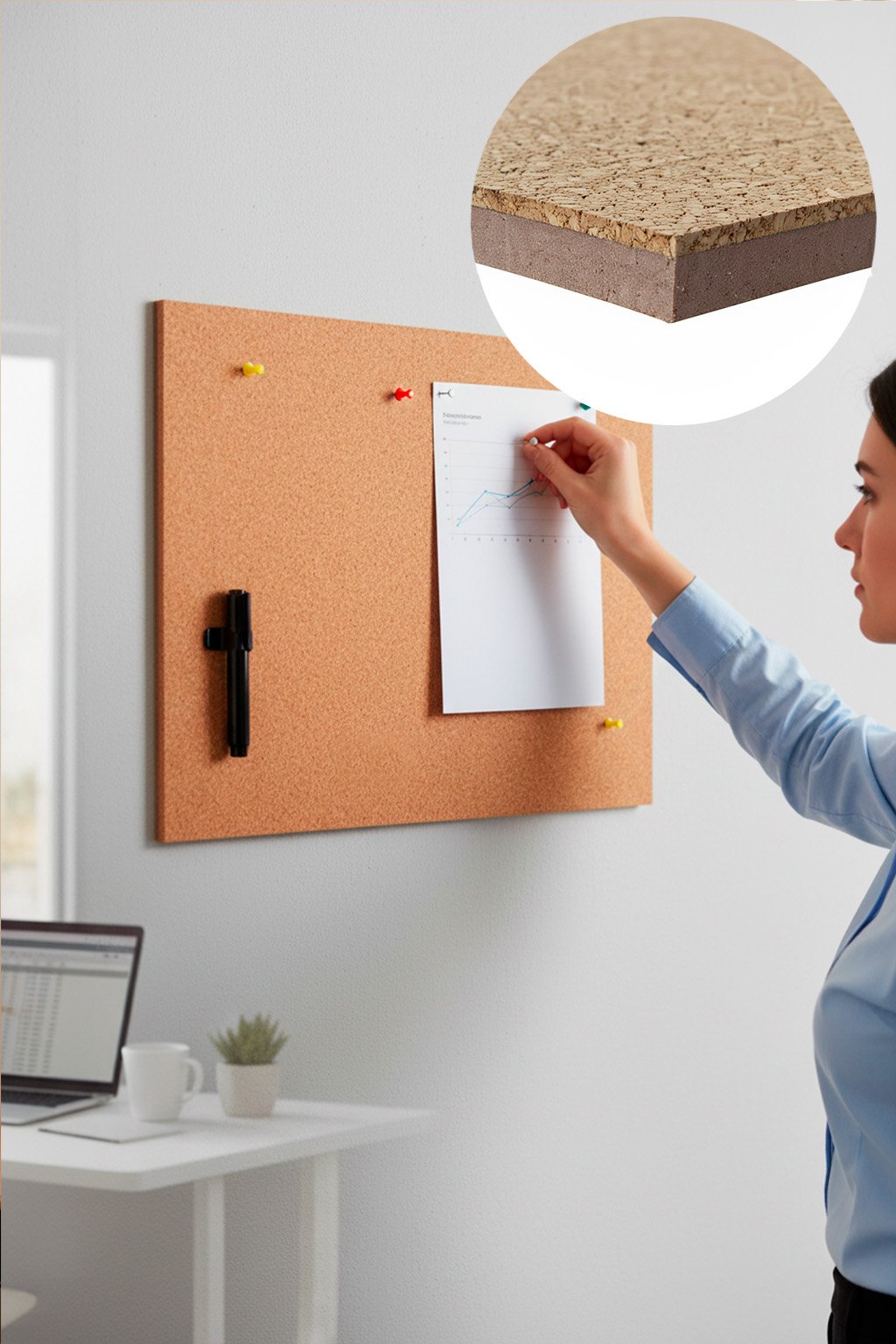 Povrch z pravého korku dodává nástěnce teplý a přirozený vzhled. Uvnitř se ale skrývá lehké a odolné pěnové jádro, díky kterému špendlíky snadno proniknou dovnitř, pevně drží a vpichy zůstávají nenápadné.