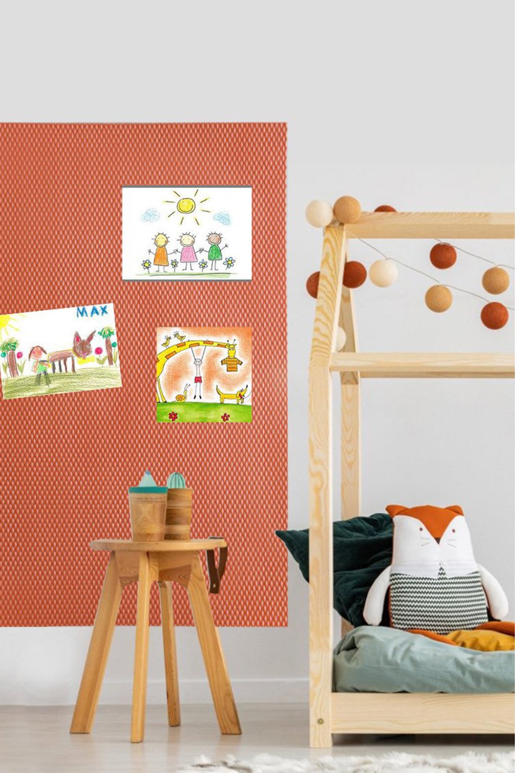 Je vhodné si na zeď načrtnout pomocí vodováhy vodící čáry, podle kterých nalepíte nástěnku rovně. Pokud Vám rozměr nevyhovuje, můžete si desky seříznout na požadovaný rozměr pomocí ostrého nože a pravítka.