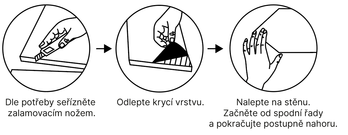 Ochranu stěn nechte před samotnou instalací několik hodin při pokojové teplotě. Aplikace je velmi jednoduchá a rychlá. Ochrana stěn je opatřena lepidlem s krycí folií. Nejprve si ochranu stěn poskládáte na zem tak, jak byste je chtěli mít umístěné na zdi. Je vhodné si na zeď načrtnout pomocí vodováhy vodící čáry, podle kterých nalepíte ochranu stěn rovně. Pokud Vám rozměr nevyhovuje, můžete si ochranu stěn seříznout na požadovaný rozměr pomocí ostrého nože a pravítka.