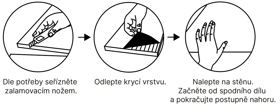 Ochranu stěn nechte před samotnou instalací několik hodin při pokojové teplotě. Aplikace je velmi jednoduchá a rychlá. Ochrana stěn je opatřena lepidlem s krycí folií. Nejprve si ochranu stěn poskládáte na zem tak, jak byste je chtěli mít umístěné na zdi. Je vhodné si na zeď načrtnout pomocí vodováhy vodící čáry, podle kterých nalepíte ochranu stěn rovně. Pokud Vám rozměr nevyhovuje, můžete si ochranu stěn seříznout na požadovaný rozměr pomocí ostrého nože a pravítka.