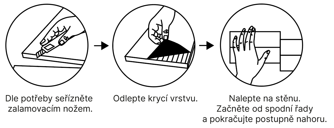 Pásy nechte před samotnou instalací několik hodin při pokojové teplotě. Aplikace je velmi jednoduchá a rychlá. Každý pás je opatřen lepidlem s krycí folií. Nejprve si pásy poskládáte na zem tak, jak byste je chtěli mít umístěné na zdi. Je vhodné si na zeď načrtnout pomocí vodováhy vodící čáry, podle kterých nalepíte pásy rovně. Pokud Vám rozměr nevyhovuje, můžete si pásy seříznout na požadovaný rozměr pomocí ostrého nože a pravítka.