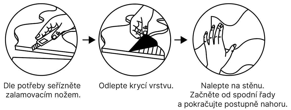 Ochranu stěn nechte před samotnou instalací několik hodin při pokojové teplotě. Aplikace je velmi jednoduchá a rychlá. Ochrana stěn je opatřena lepidlem s krycí folií. Nejprve si ochranu stěn poskládáte na zem tak, jak byste je chtěli mít umístěné na zdi. Je vhodné si na zeď načrtnout pomocí vodováhy vodící čáry, podle kterých nalepíte ochranu stěn rovně. Pokud Vám rozměr nevyhovuje, můžete si ochranu stěn seříznout na požadovaný rozměr pomocí ostrého nože a pravítka.