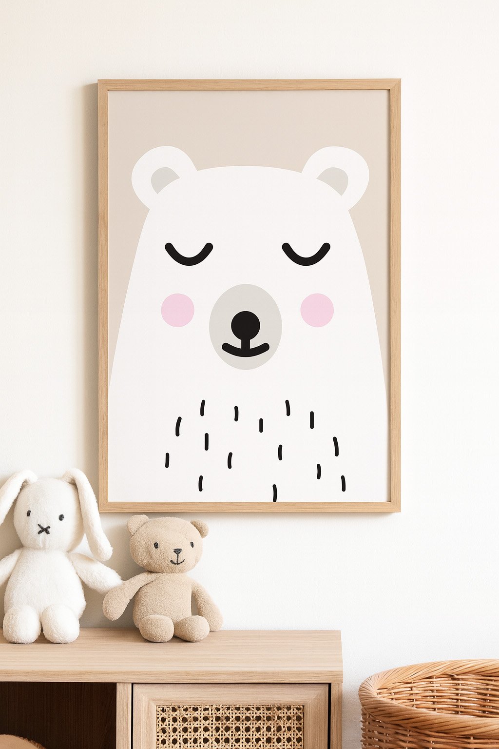 Ilustrovaný plakát s roztomilým bílým medvědem přinese do interiéru jemnost a klid. Minimalistický motiv se hodí do dětského pokoje i moderního domova a snadno se kombinuje s dalšími dekoracemi.