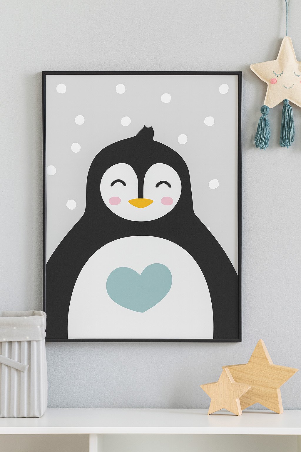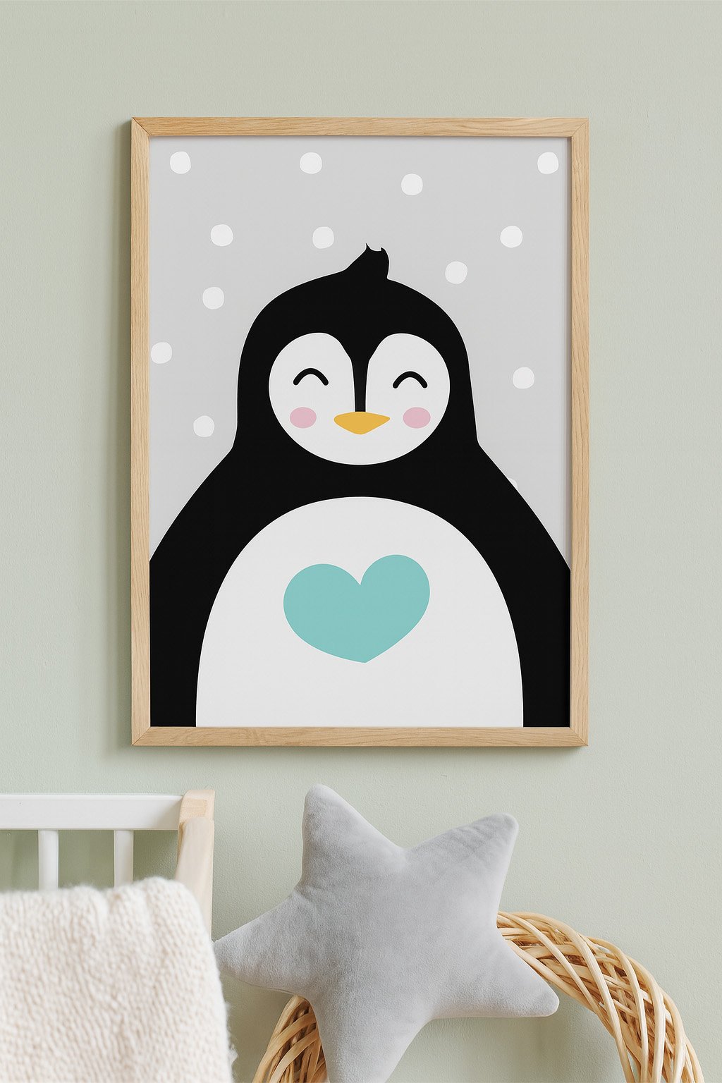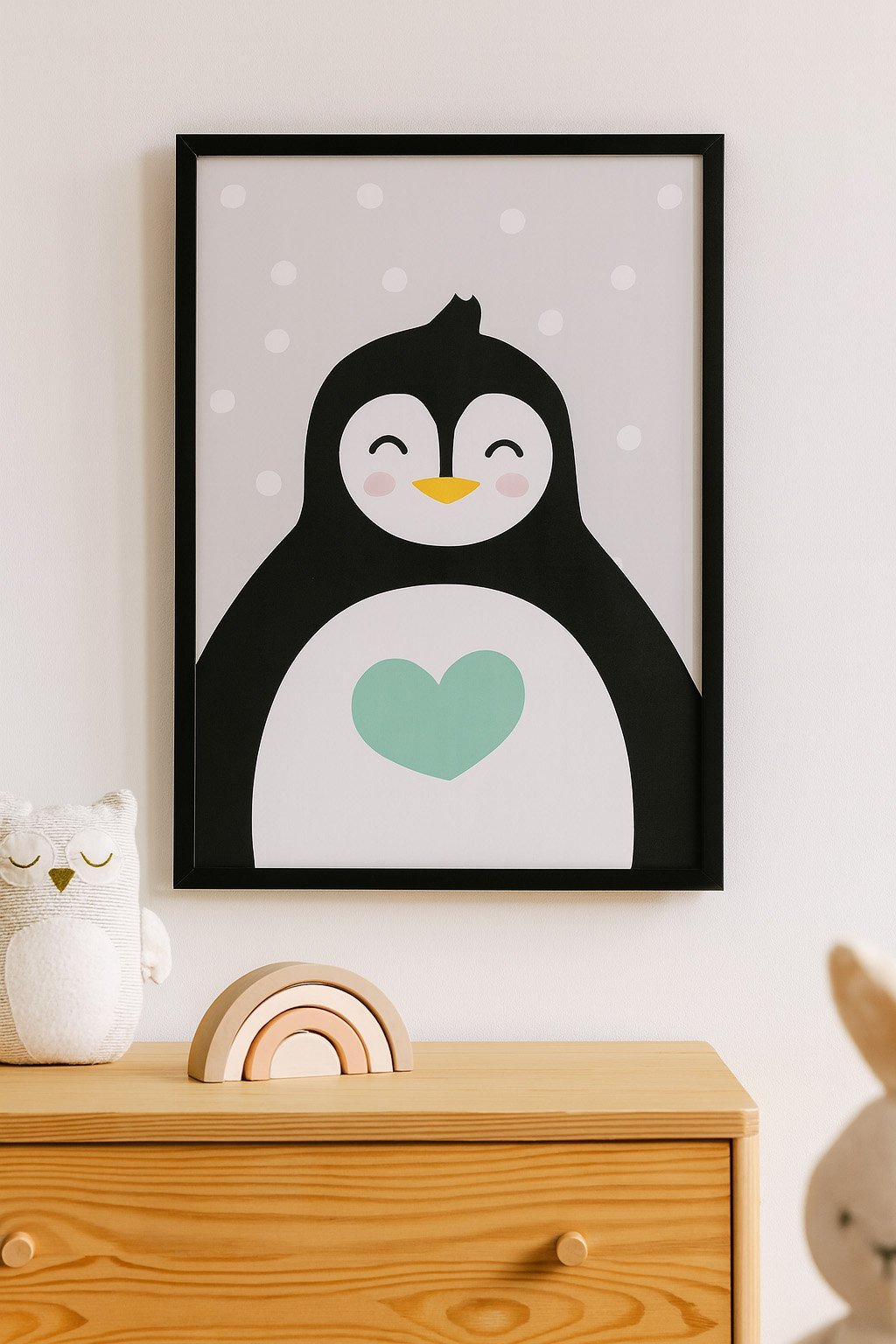 Plakát s ilustrací roztomilého tučňáka, který má na bříšku srdíčko v jemné mint barvě, dodá interiéru hravost a něhu. Skvěle se hodí do dětského pokoje nebo jako milý dárek pro malé i velké milovníky zvířat.