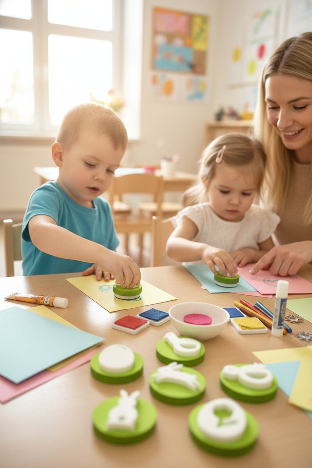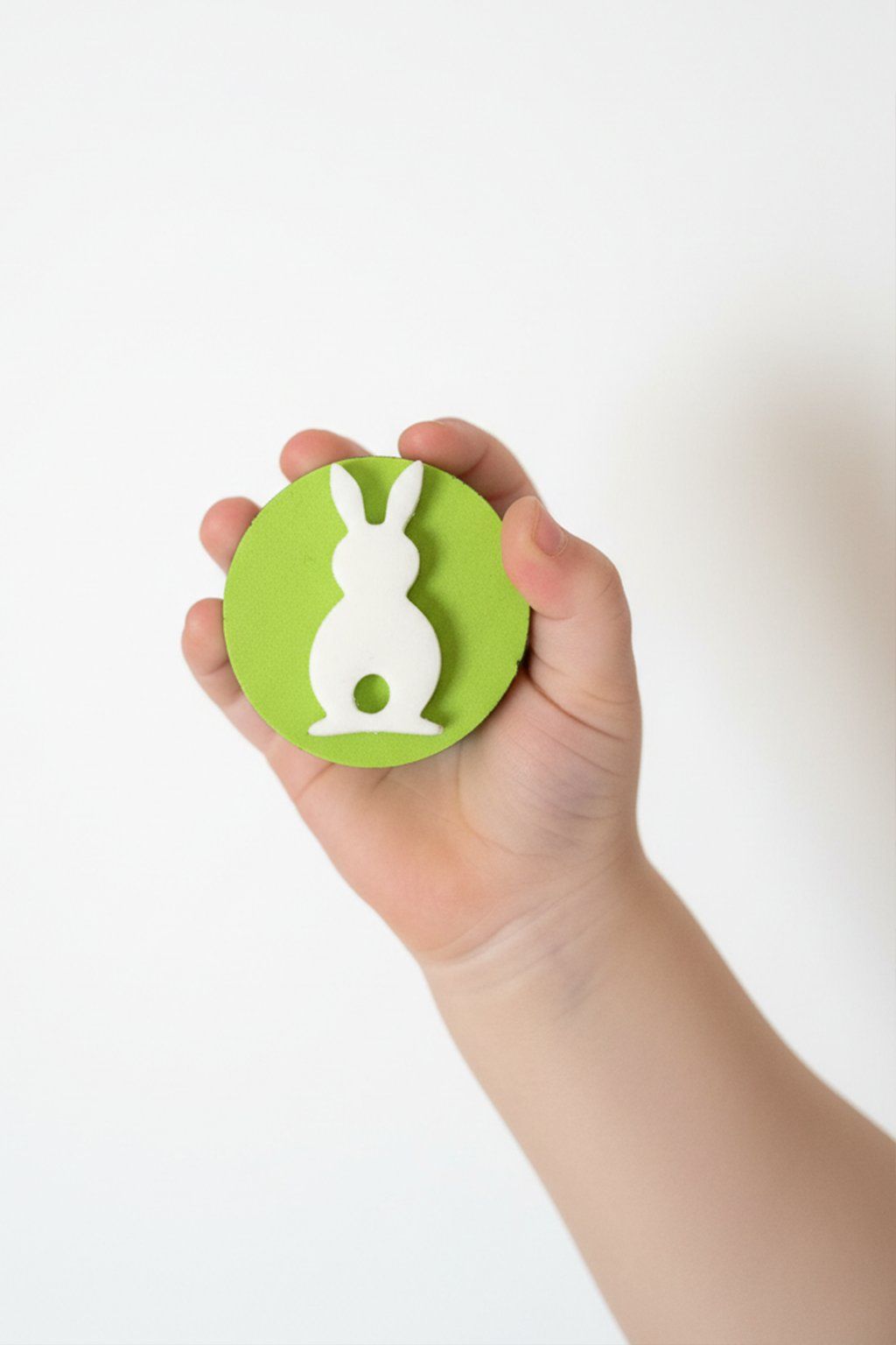 Obsahuje 6 kusů razítek o průměru 5,5 cm v motivech zajíců, slepiček a vajíček.